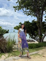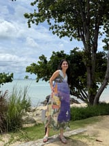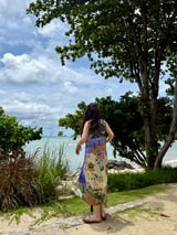 Blue Scenic Print Cotton V-Neck Midi Dress with Pockets