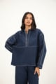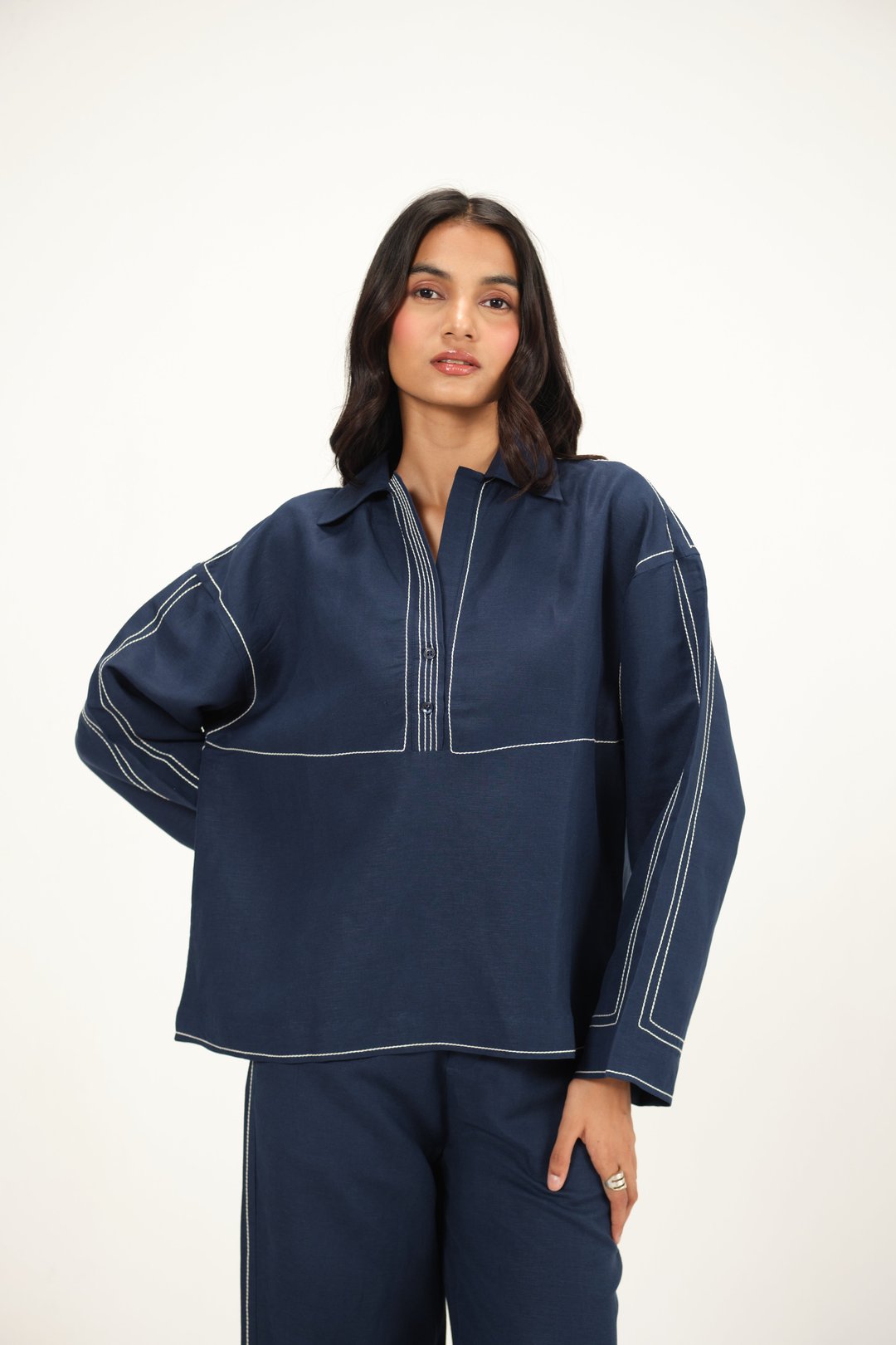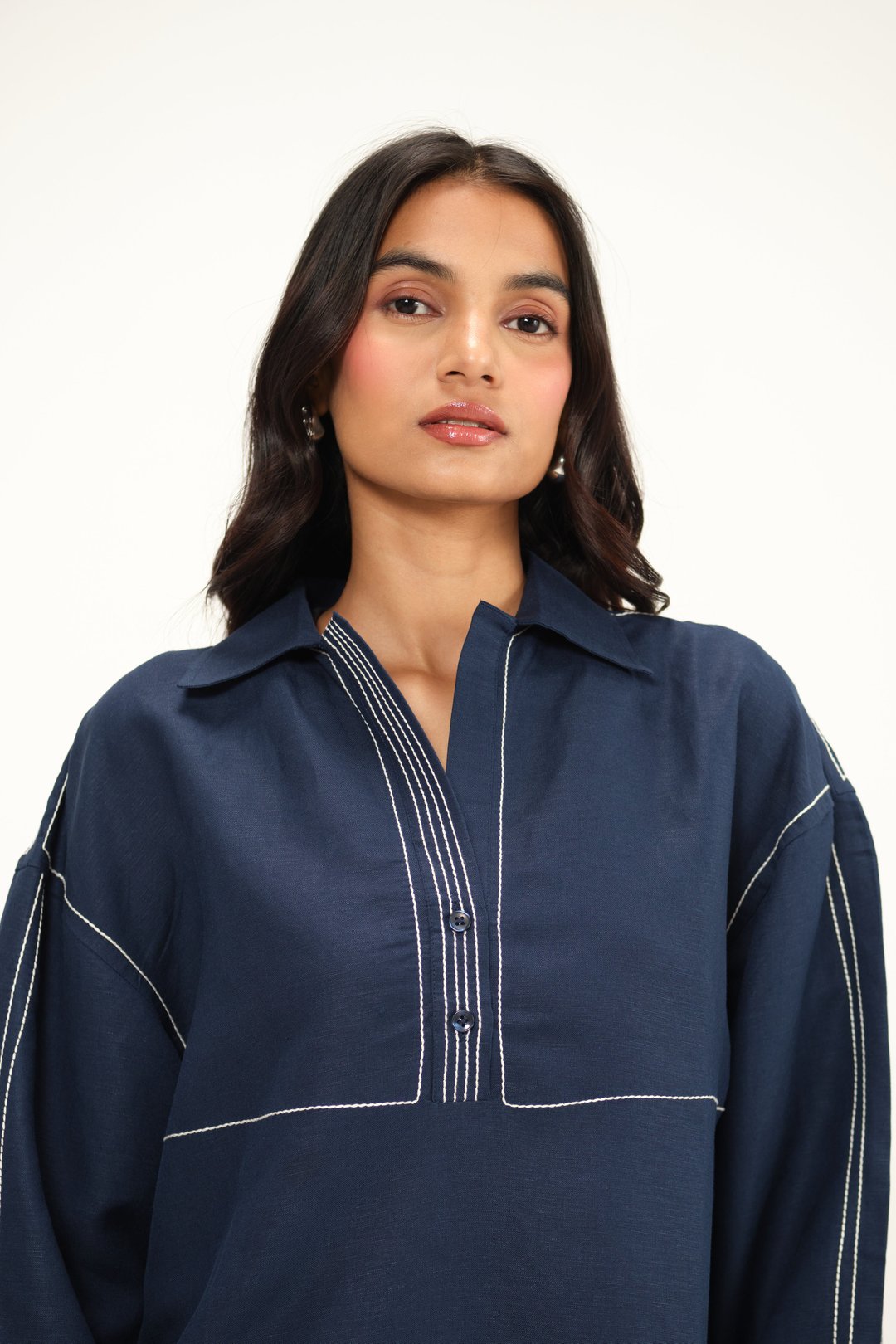 100% Linen Top Stitch Detail Navy Blue Co-Ord Set