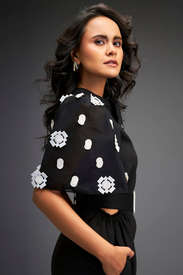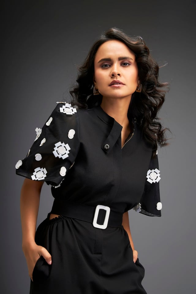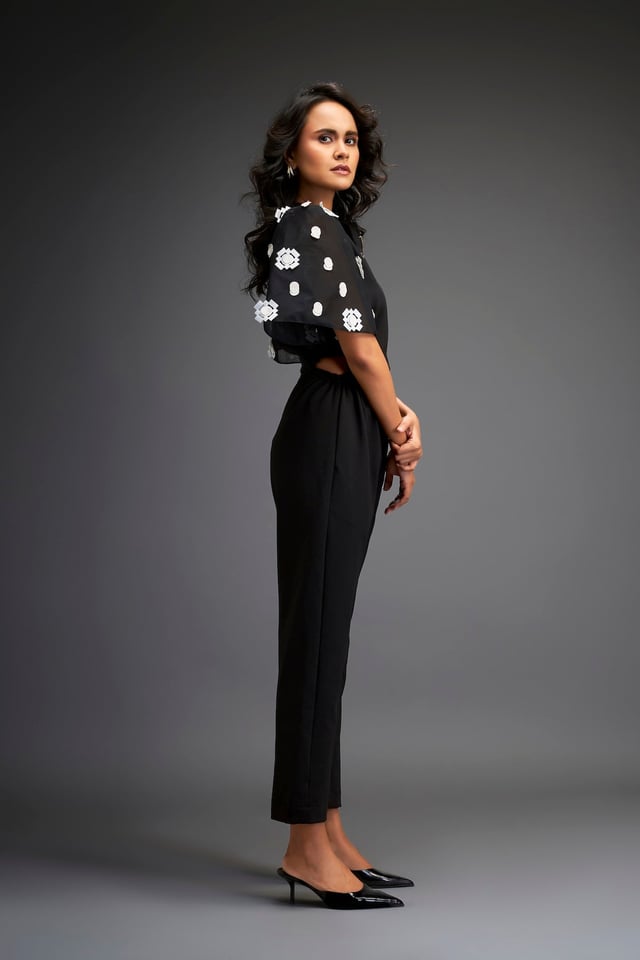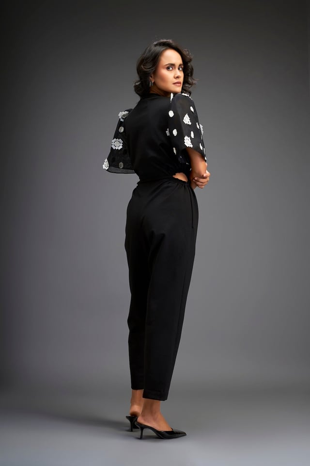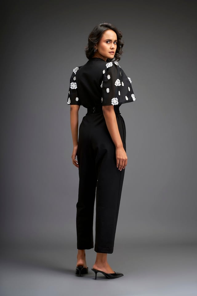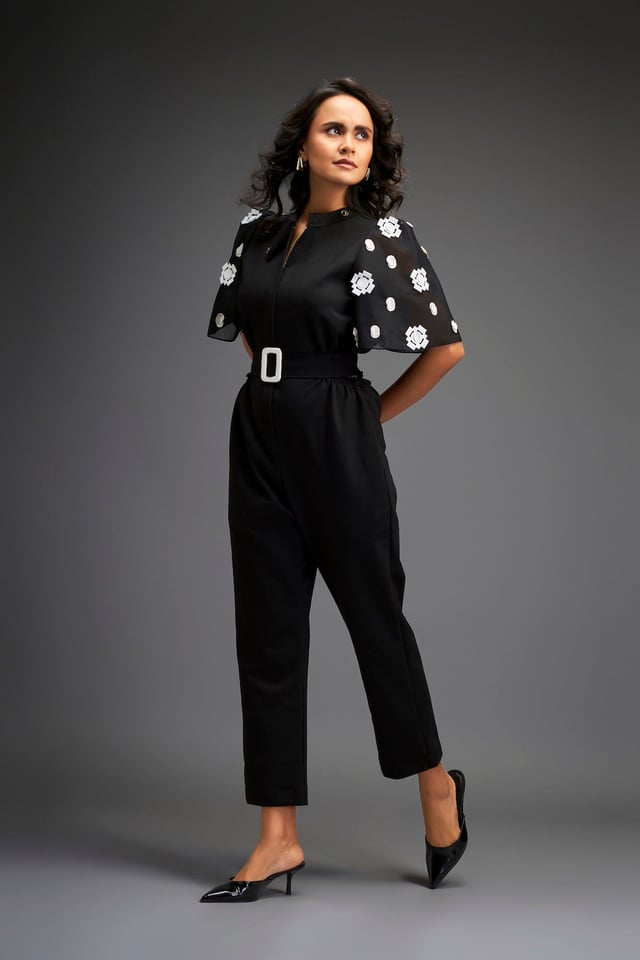 Black Embroidered Sleeves Jumpsuit with Belt