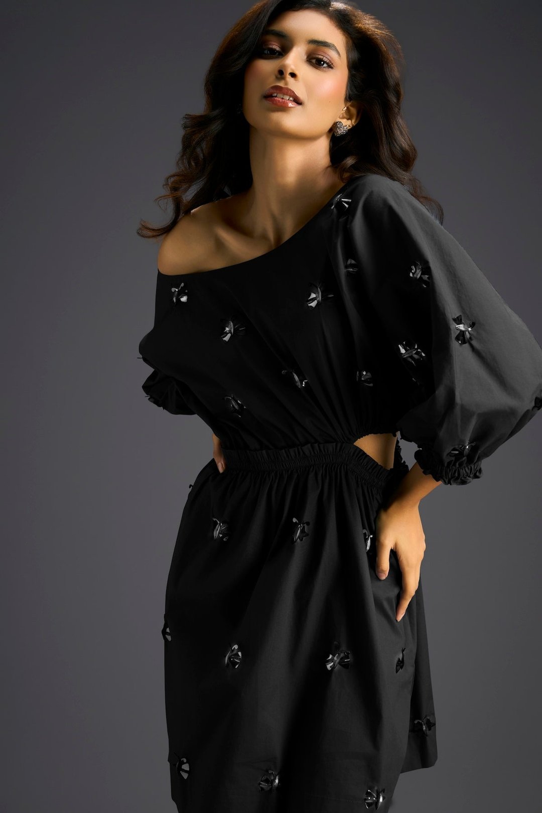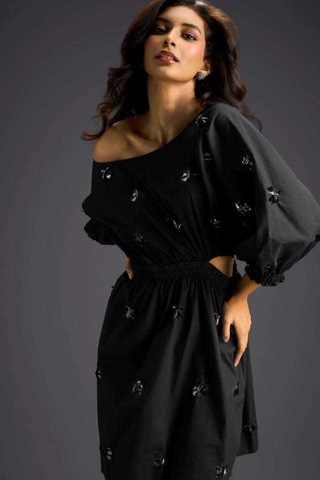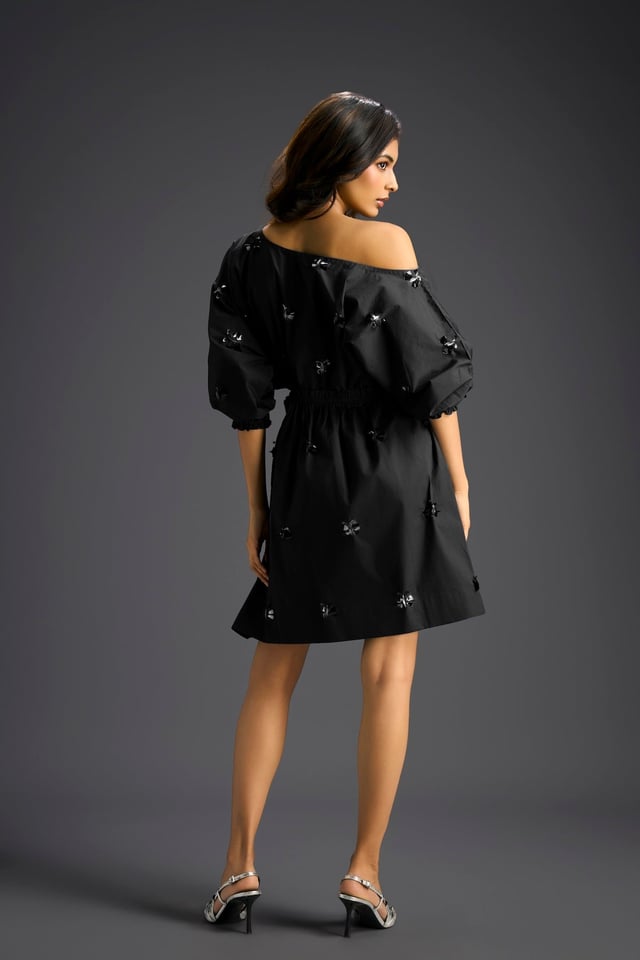 Black Off-Shoulder Dress with Butterfly Embellishments