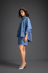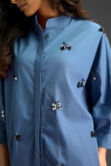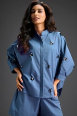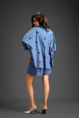 Blue Butterfly Embellished Pleated Shirt & Shorts Set