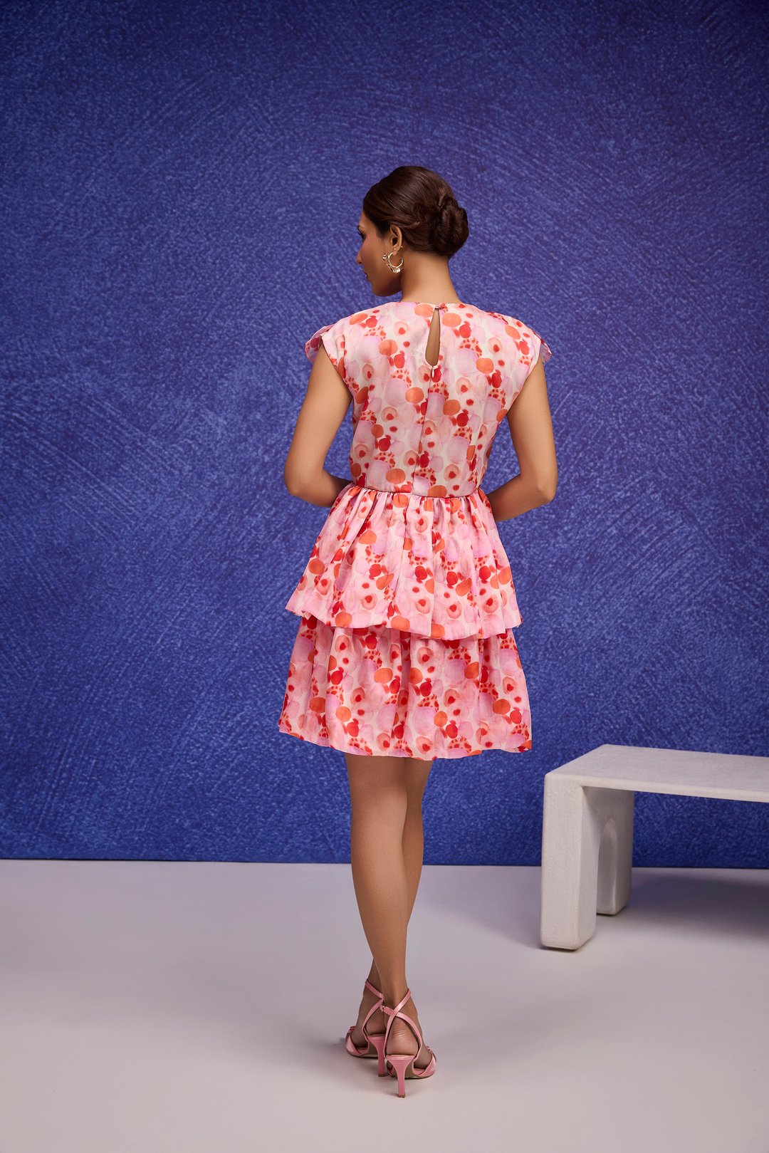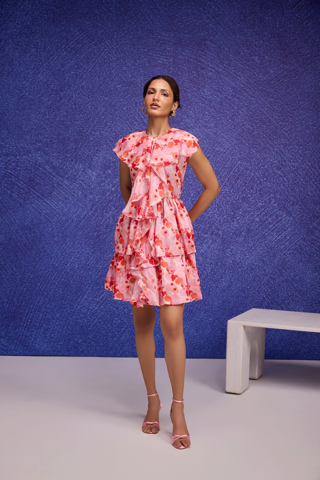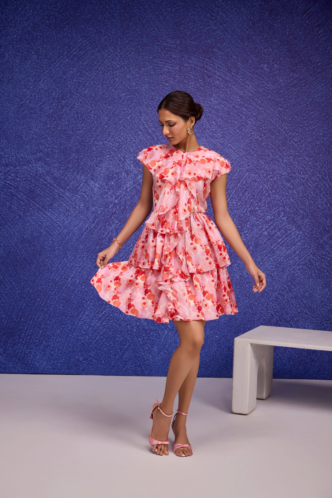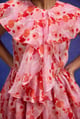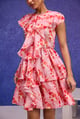 Red Aquarelle Print Silk Organza Ruffle Dress
