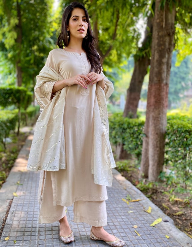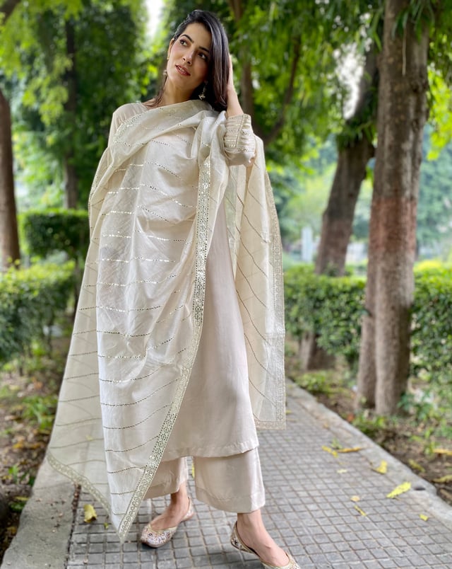 Fawn Mirror Work Chanderi Dupatta Kurta Set