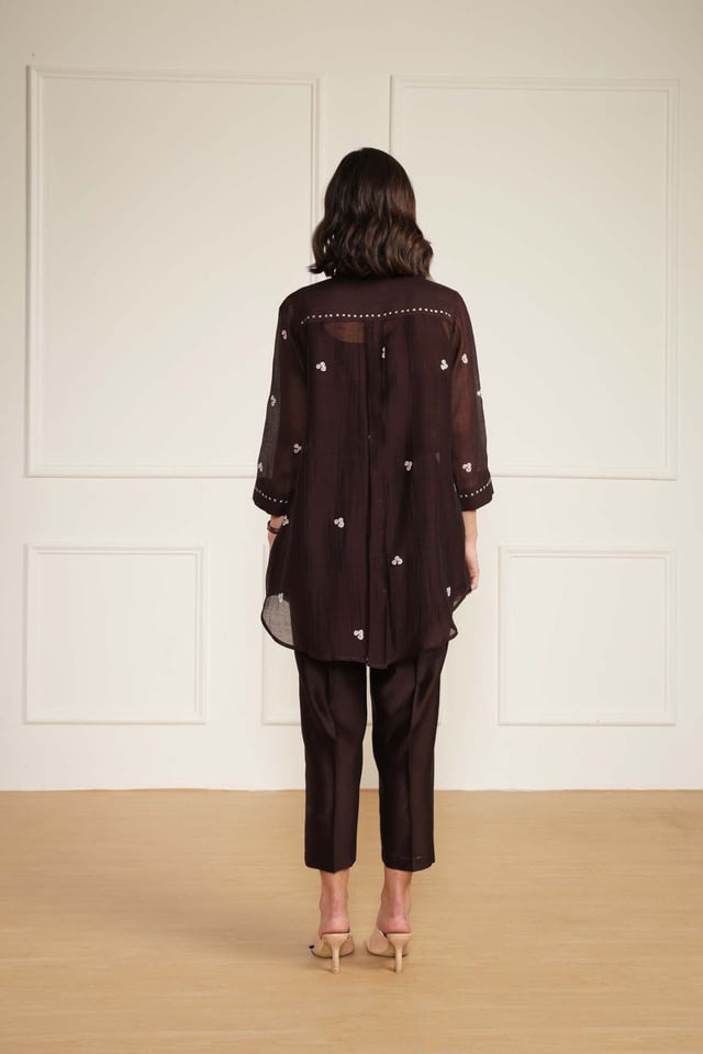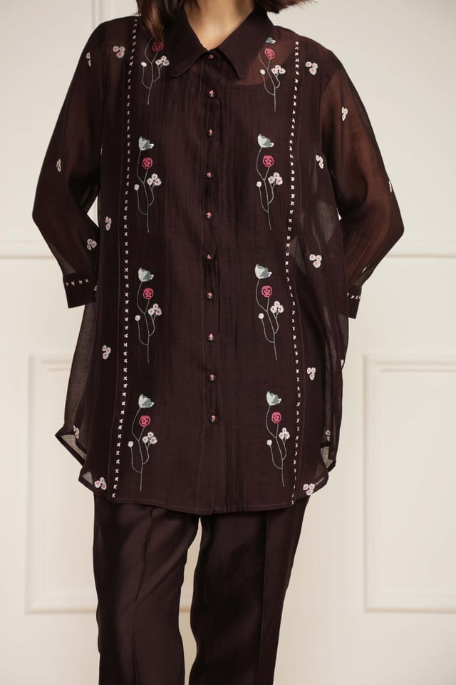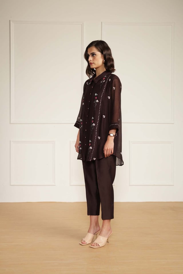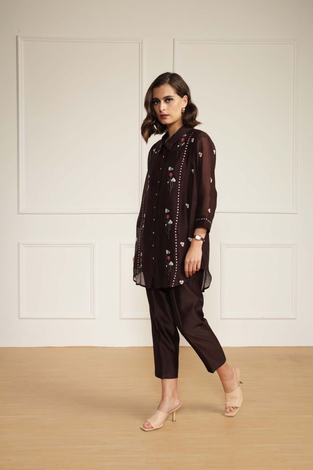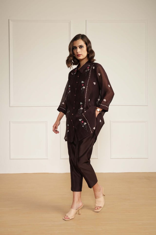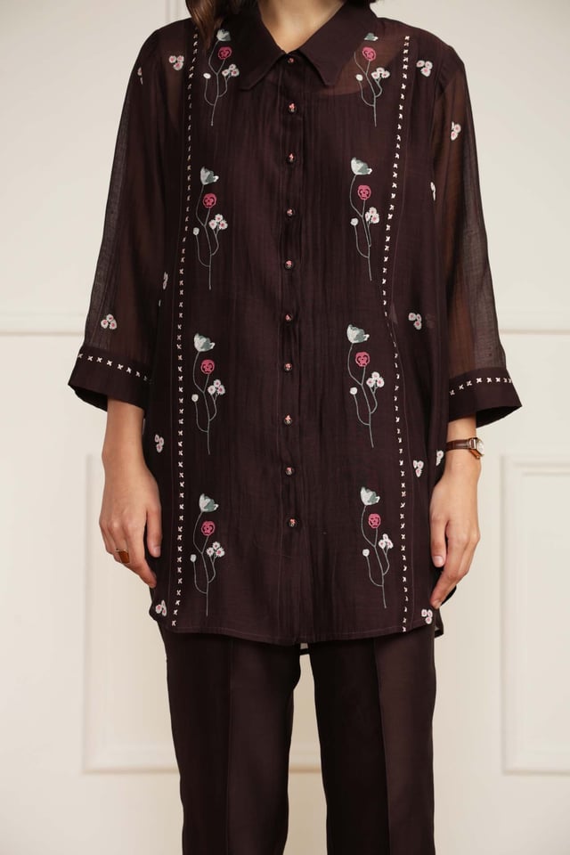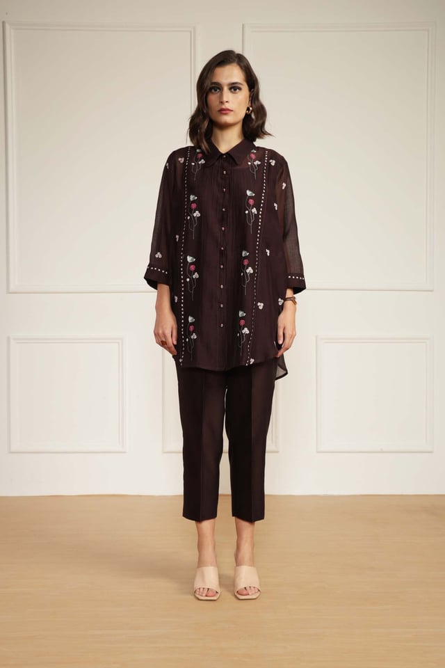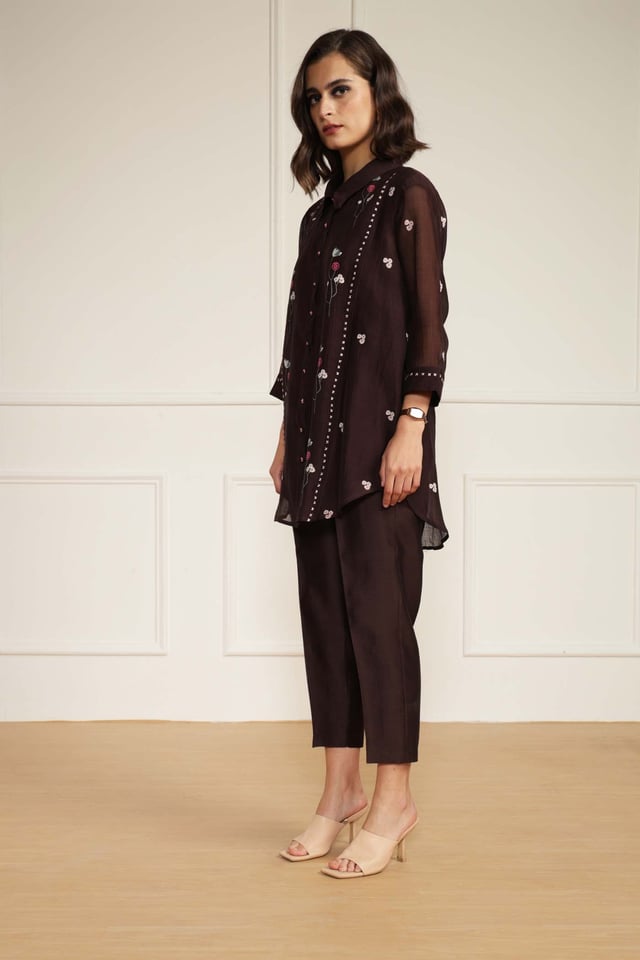 Grape Mul Chanderi Shirt with Embroidery and Silk Chanderi Straight Pants