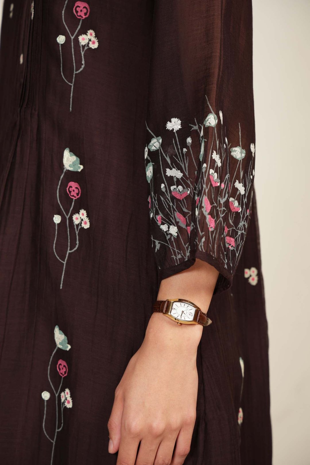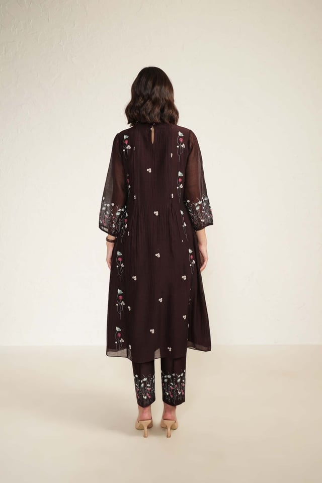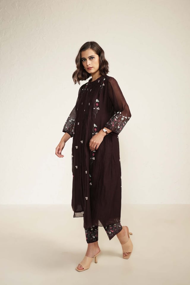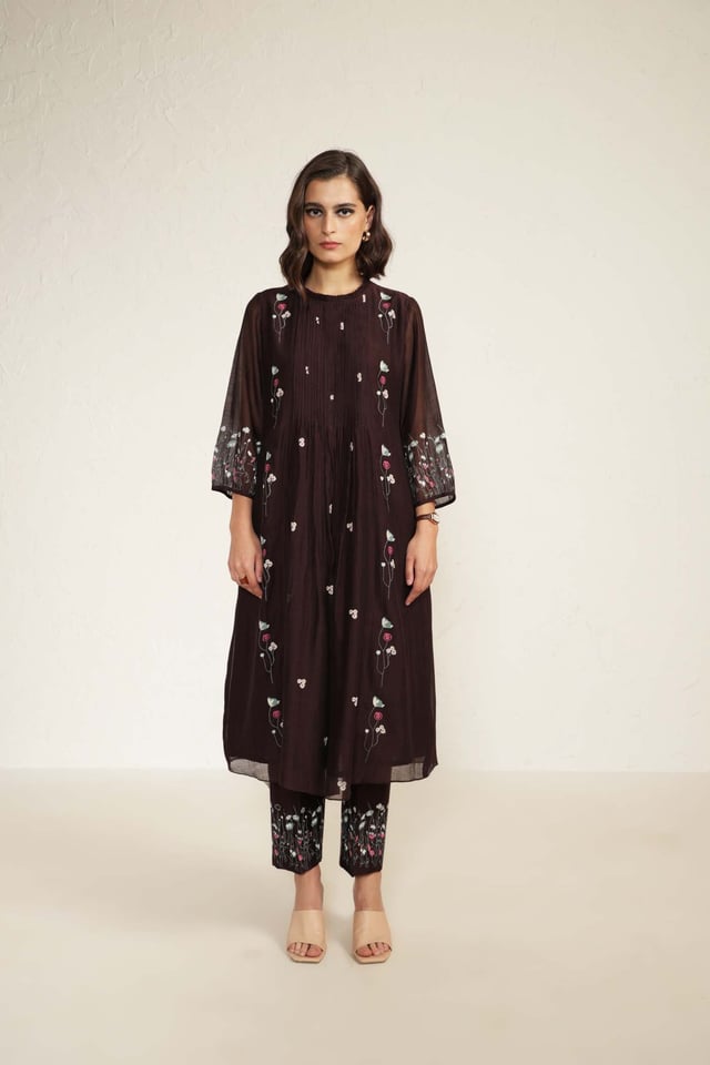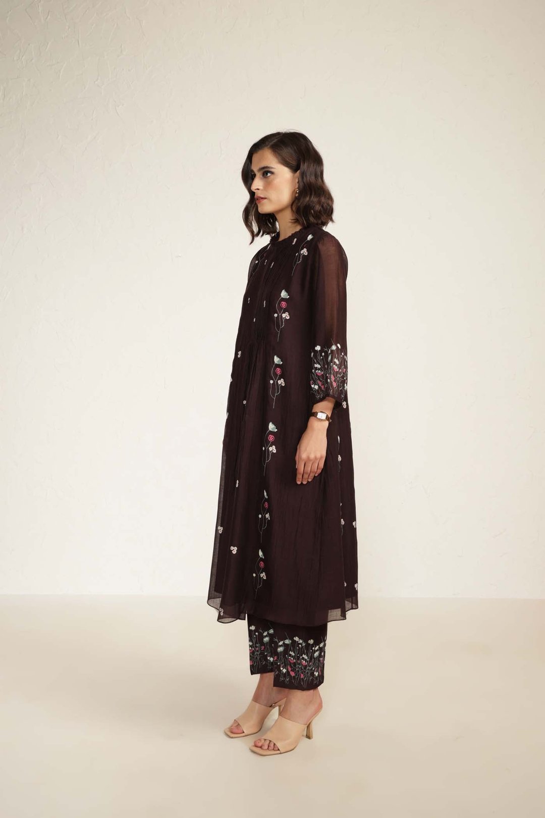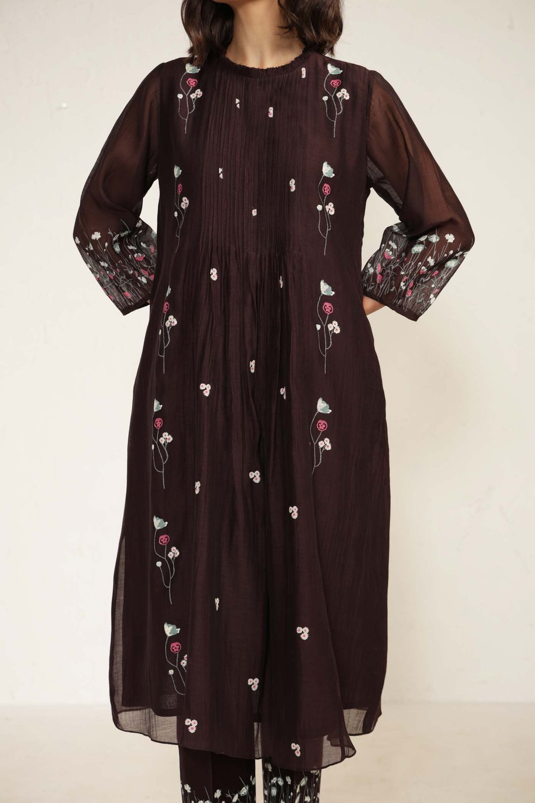 Grape Mul Chanderi Pleated Tunic with Straight Printed Pants in Silk Chanderi
