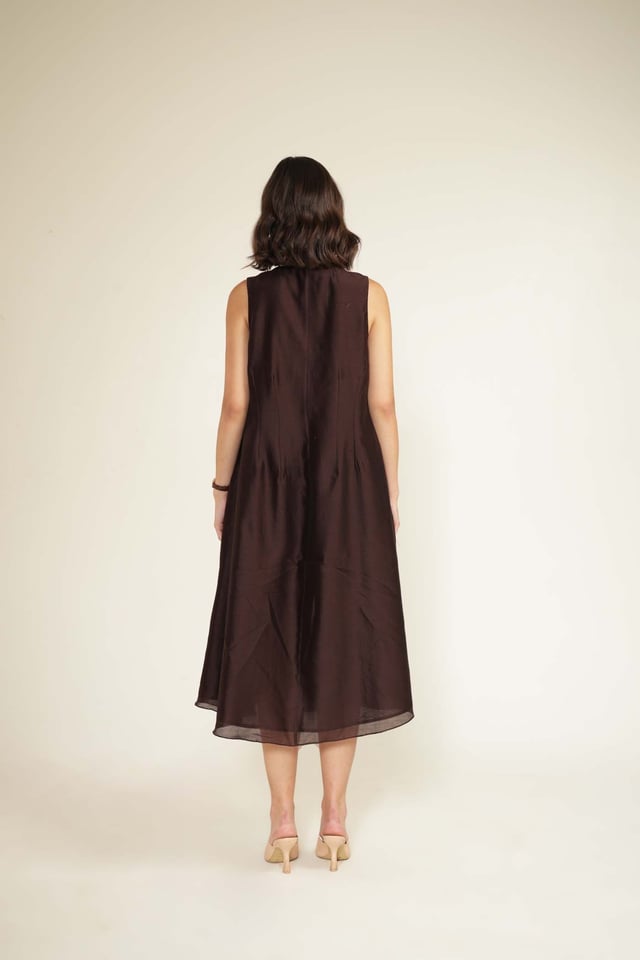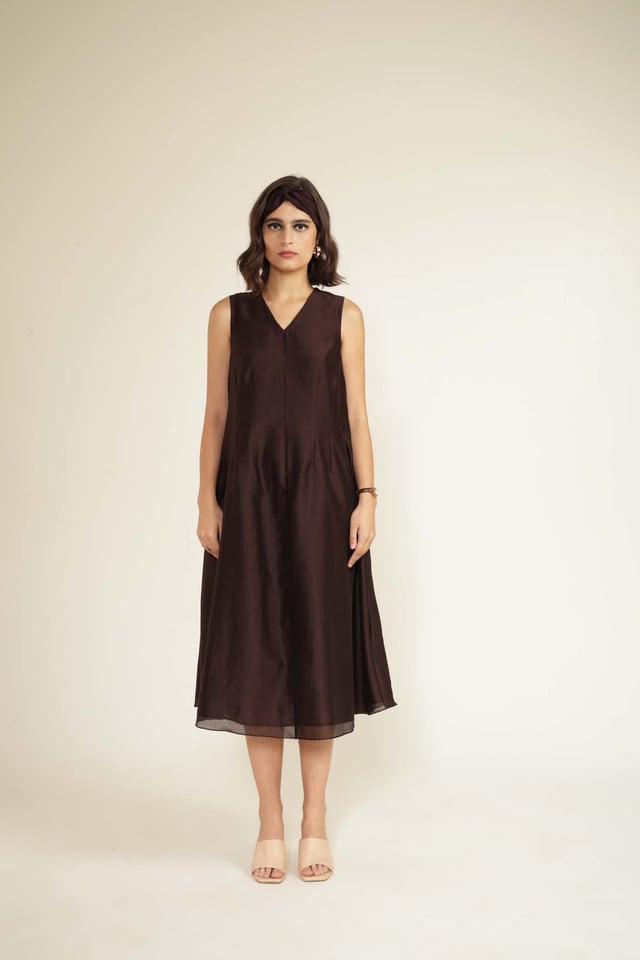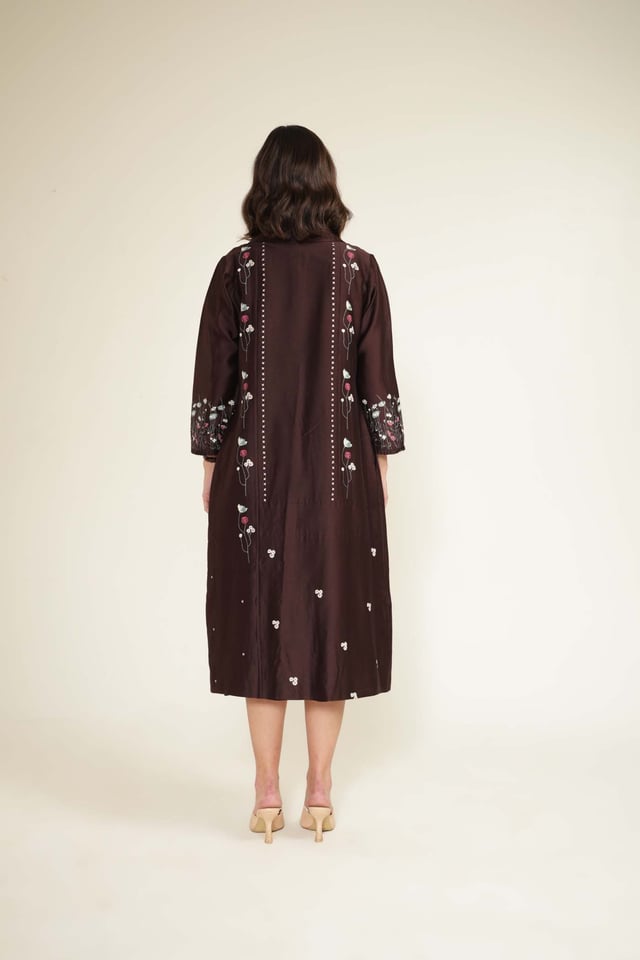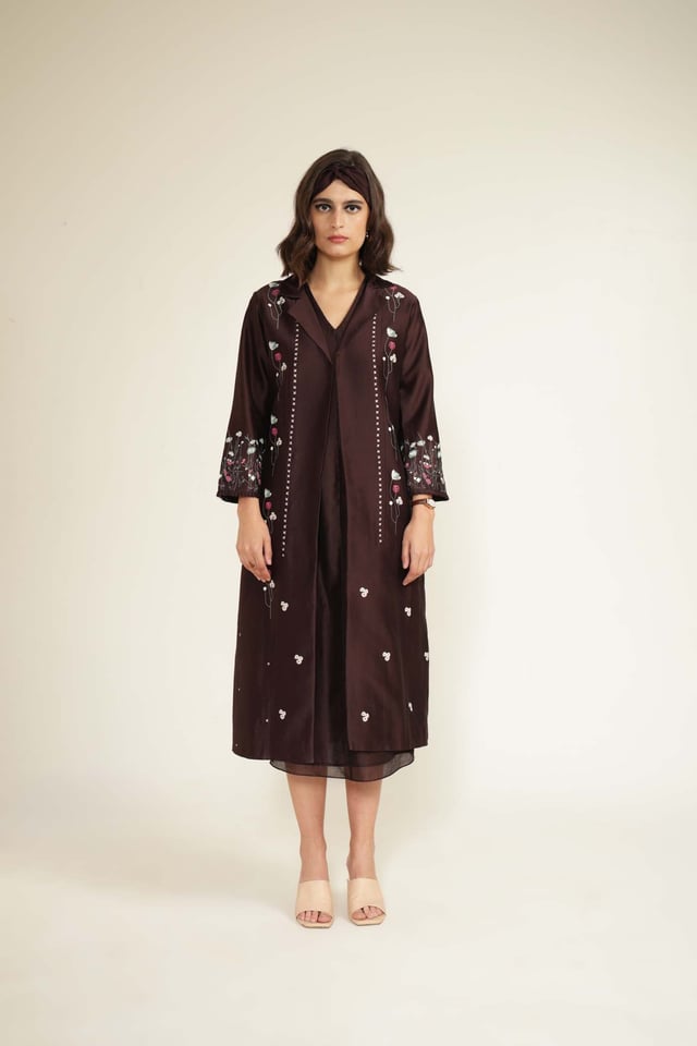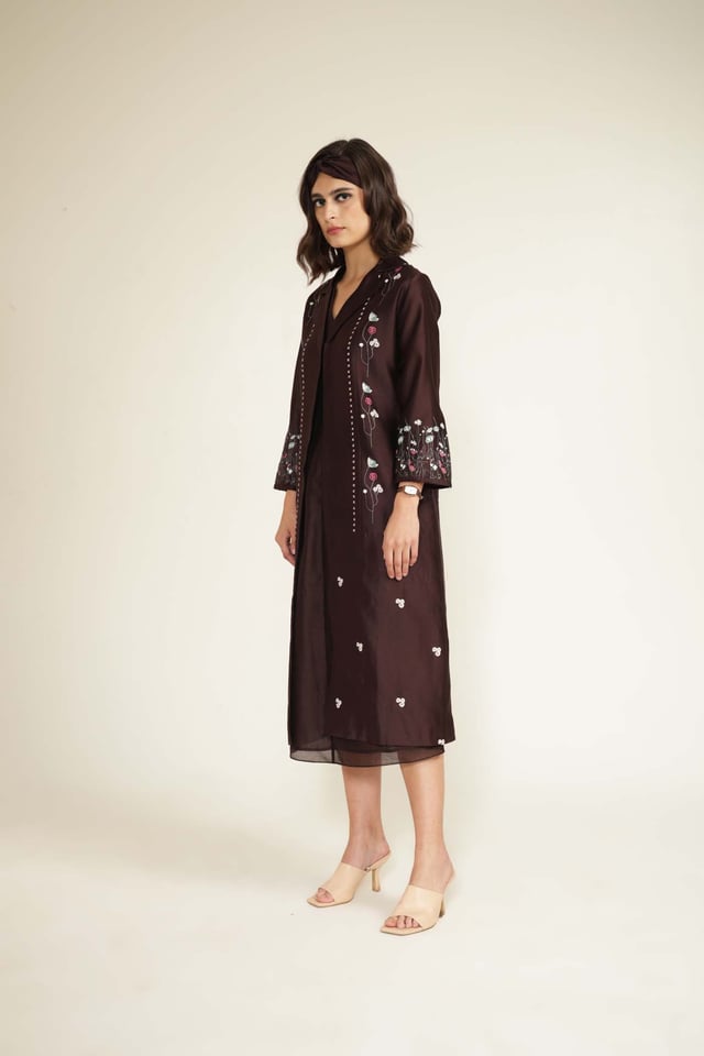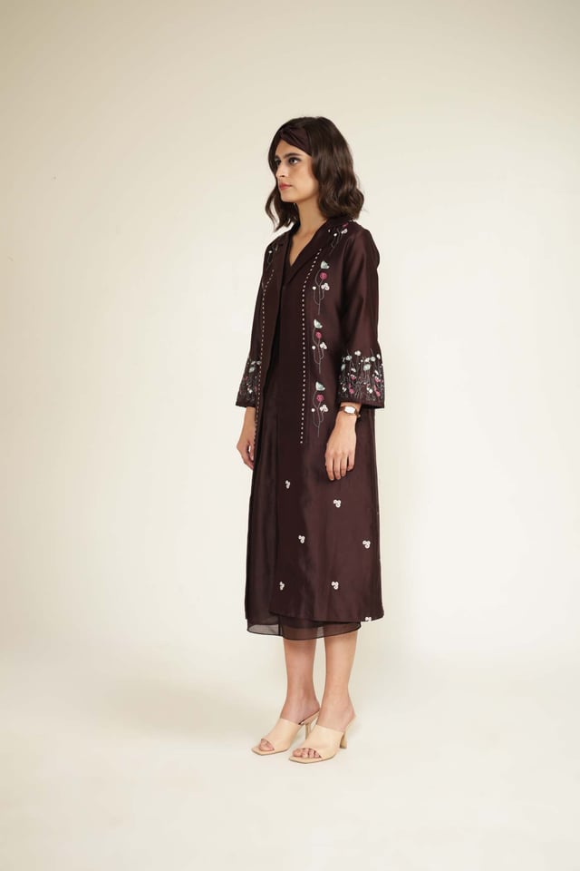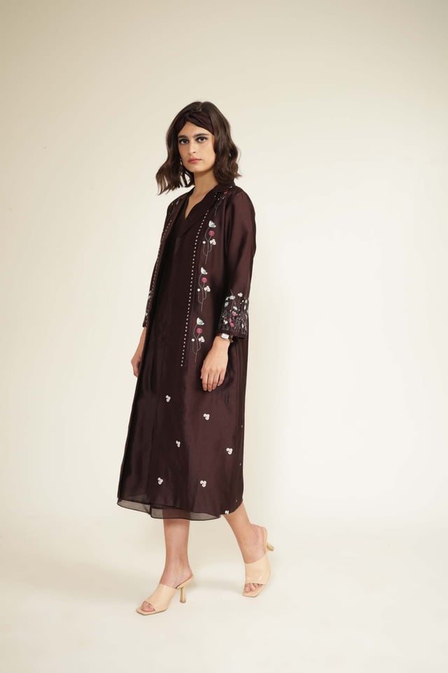 Grape V-Neck Dress in Silk Chanderi and Printed Silk Chanderi Jacket with Embroidery