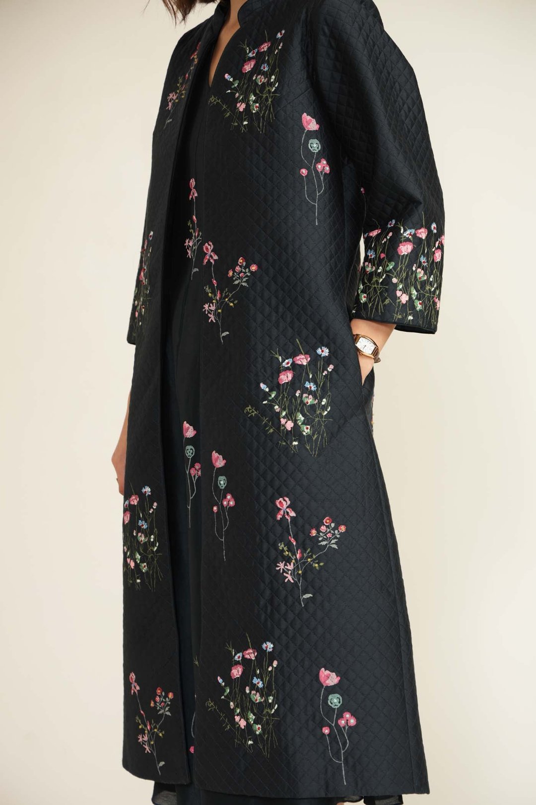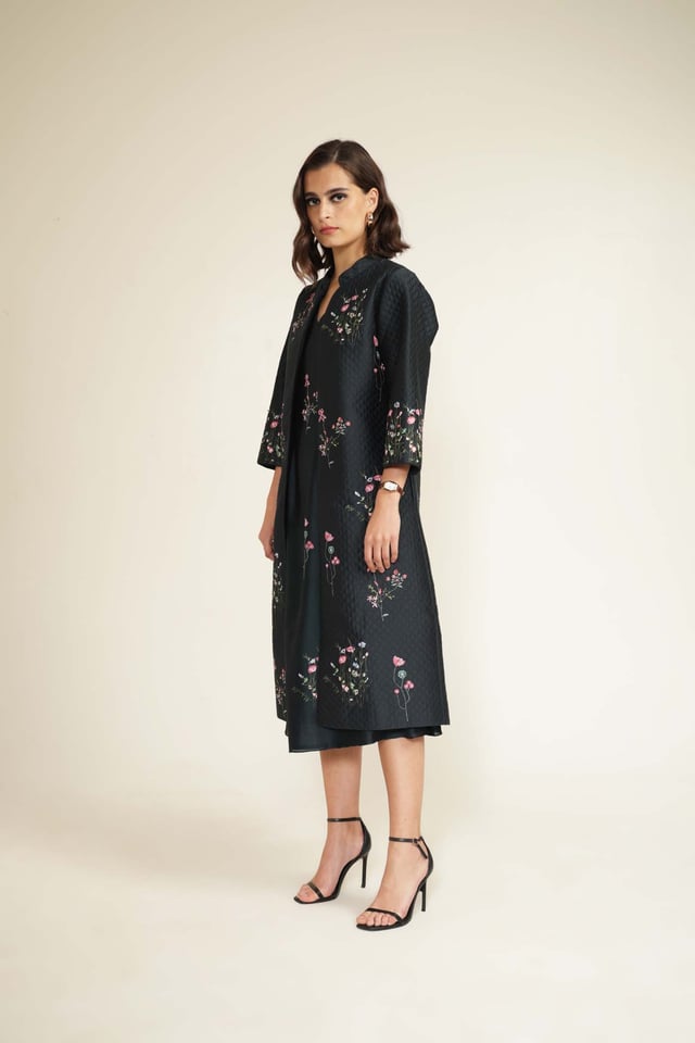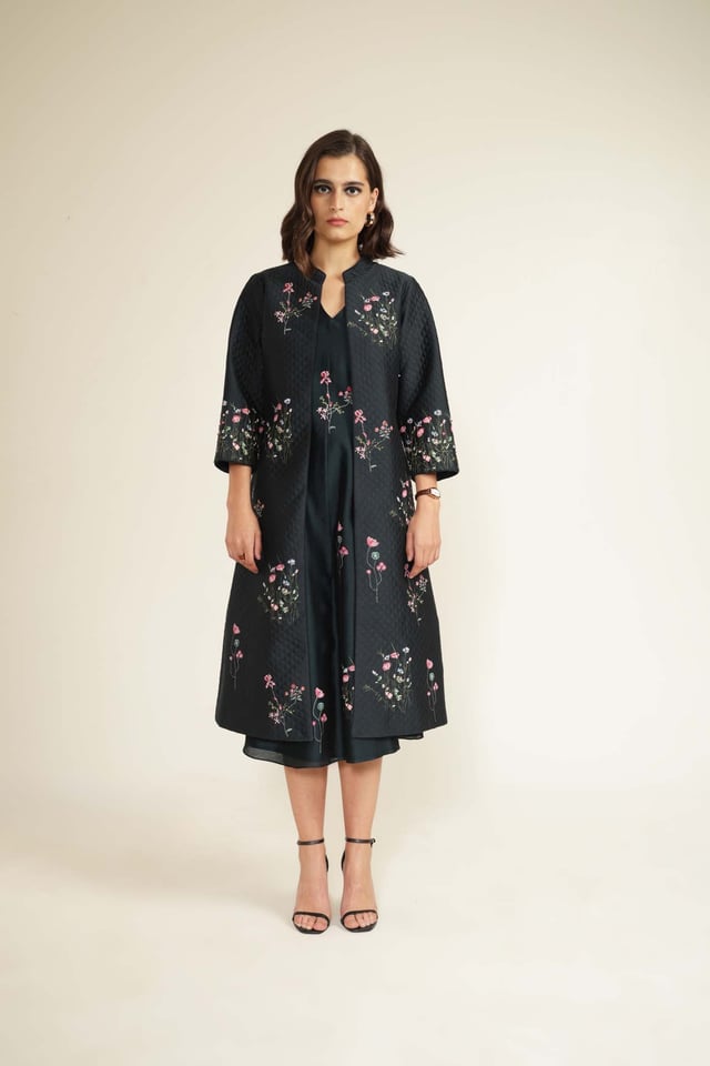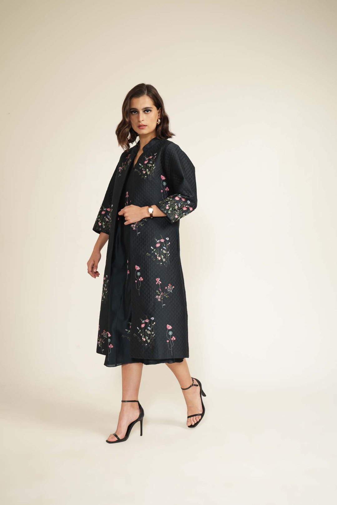 Indigo V-Neck Printed Dress with Printed Quilted Jacket with Hand Embroidery Details