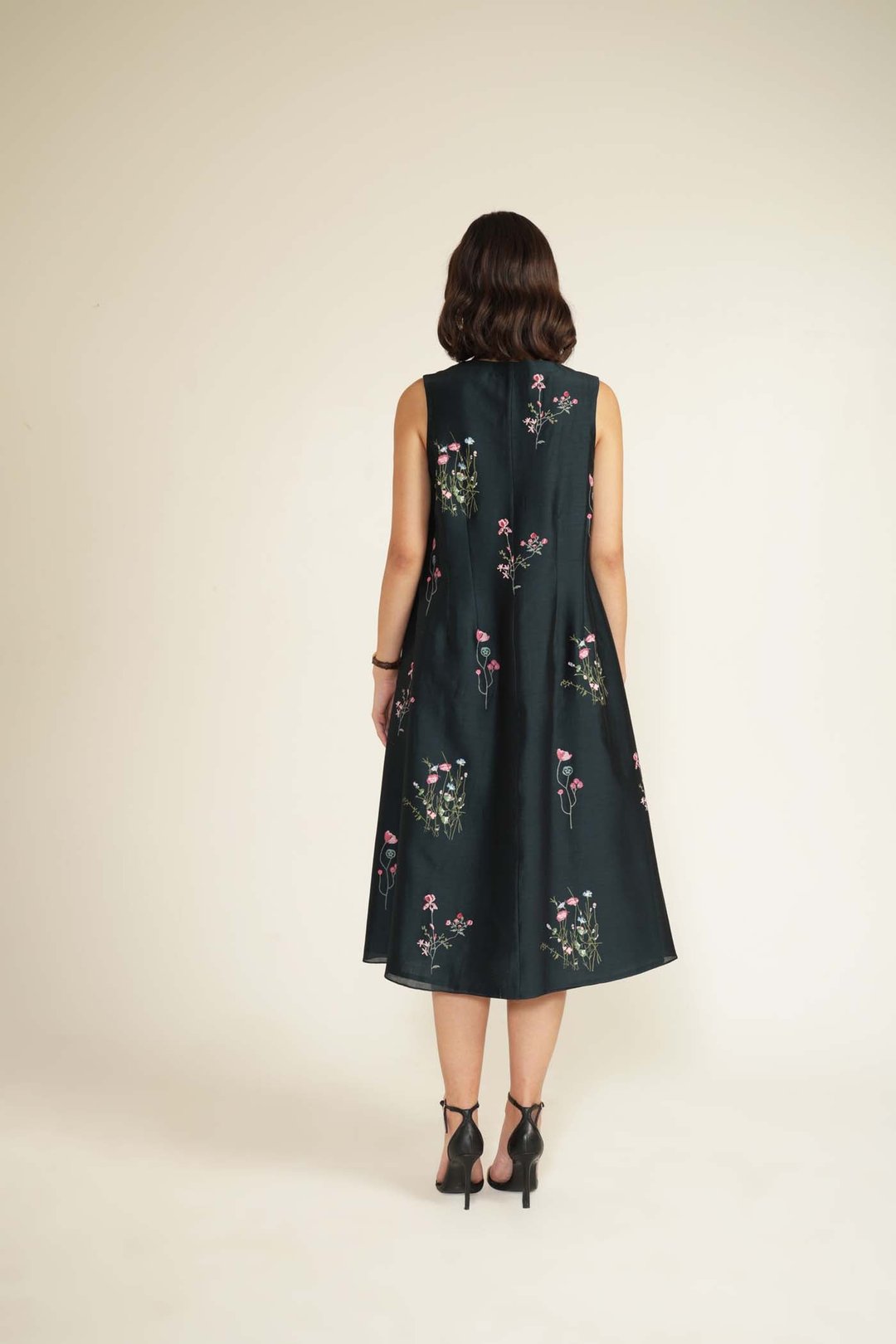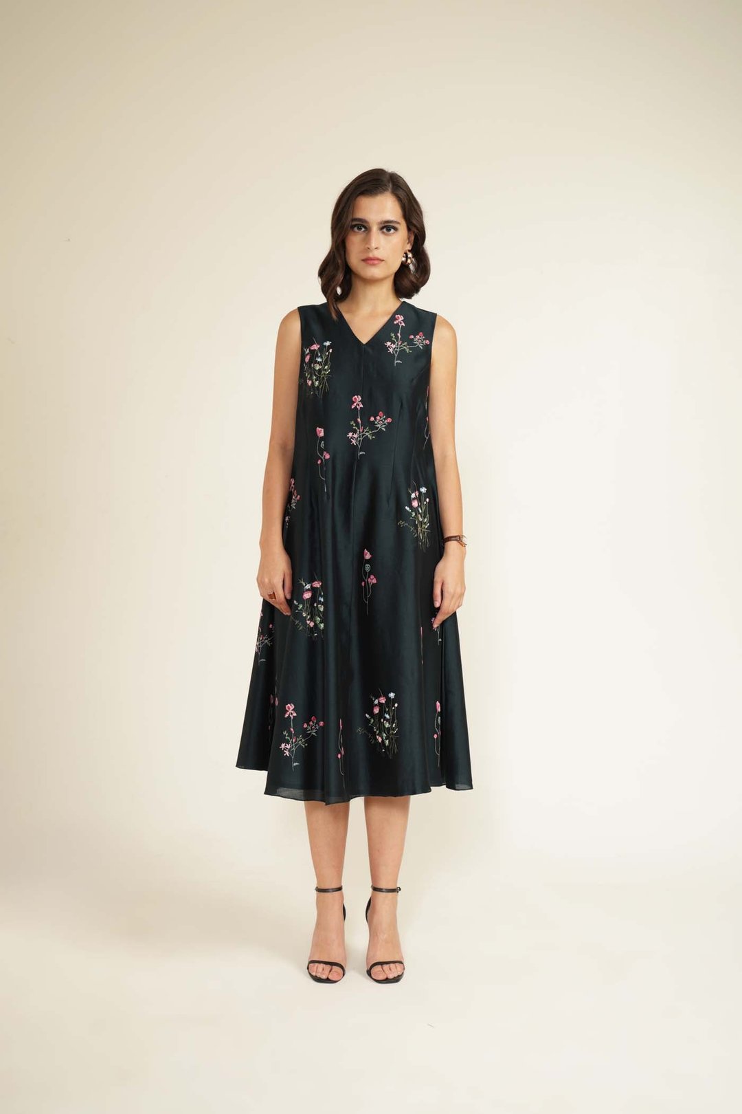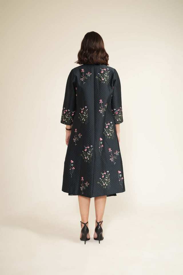 Indigo V-Neck Printed Dress with Printed Quilted Jacket with Hand Embroidery Details