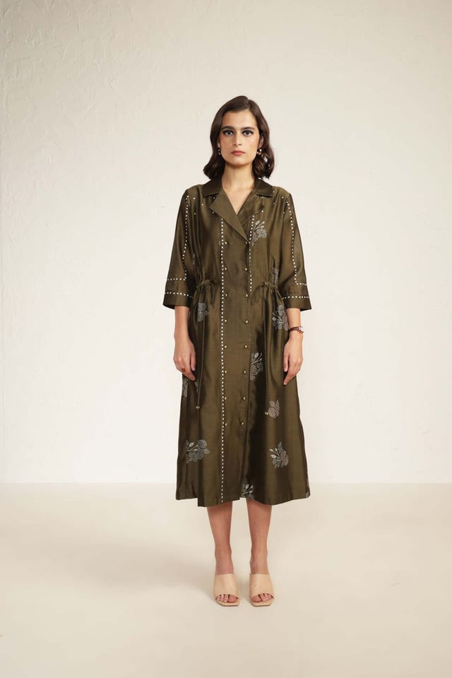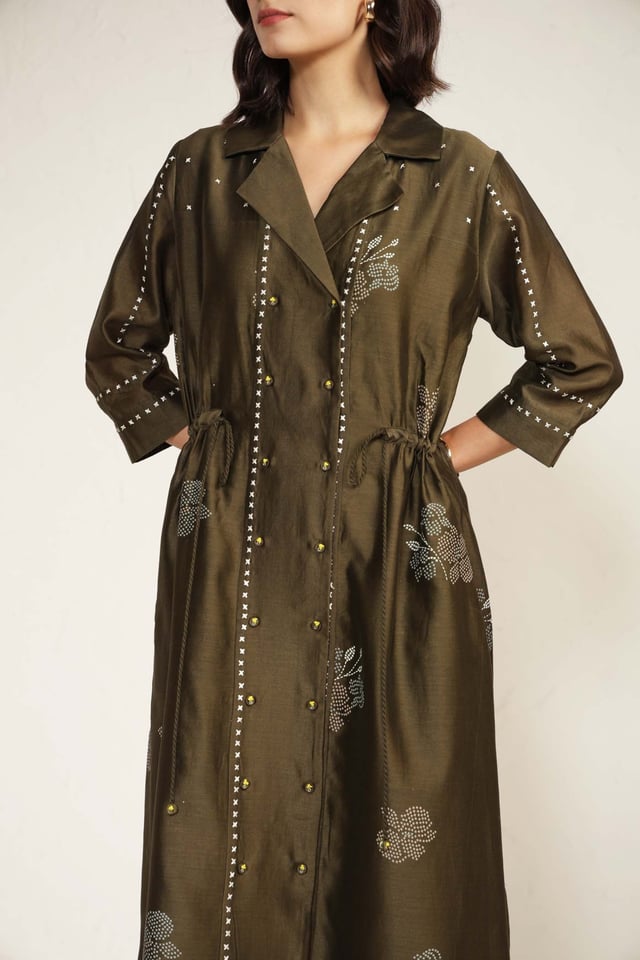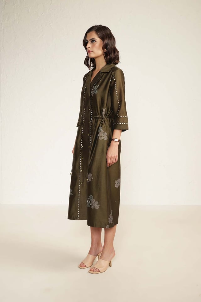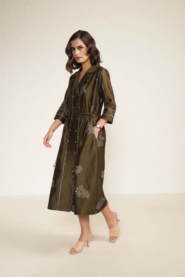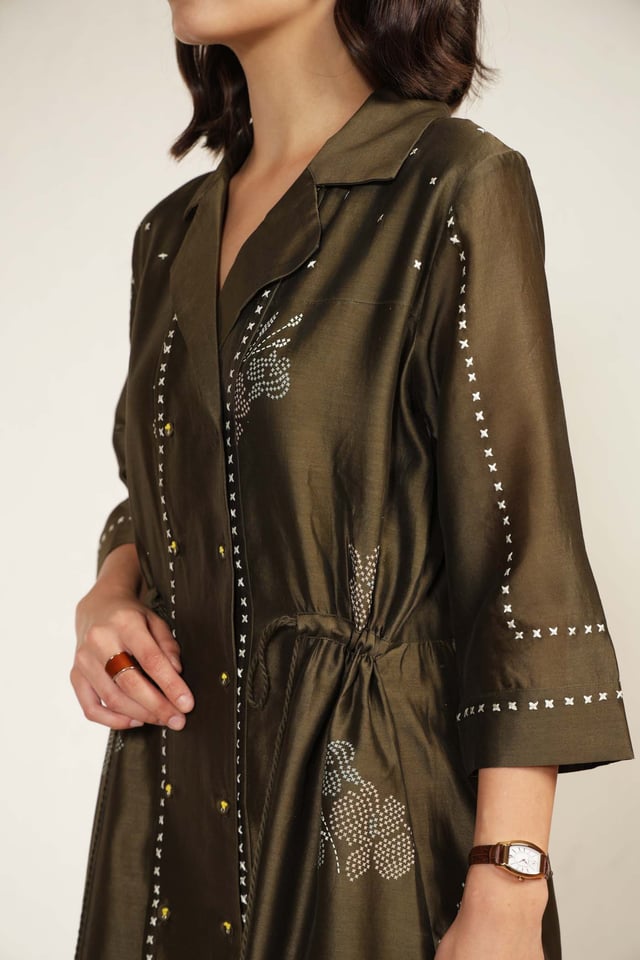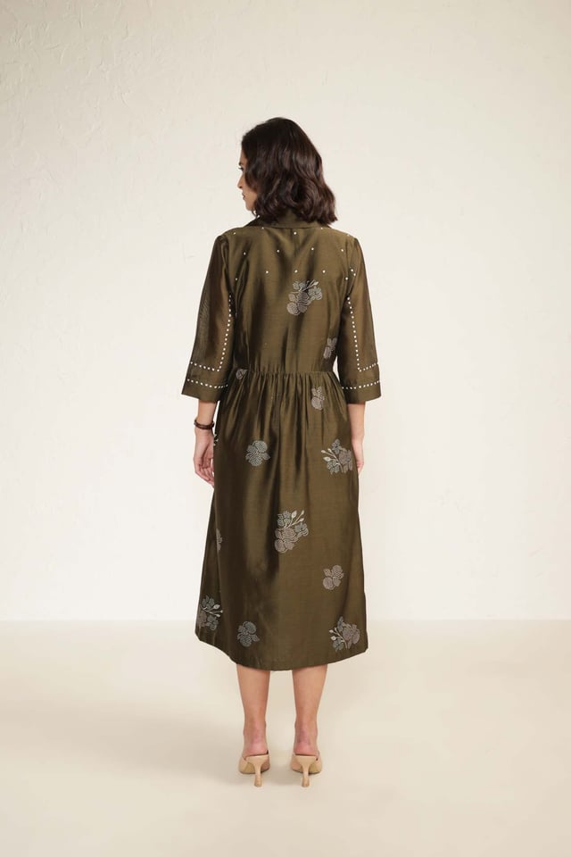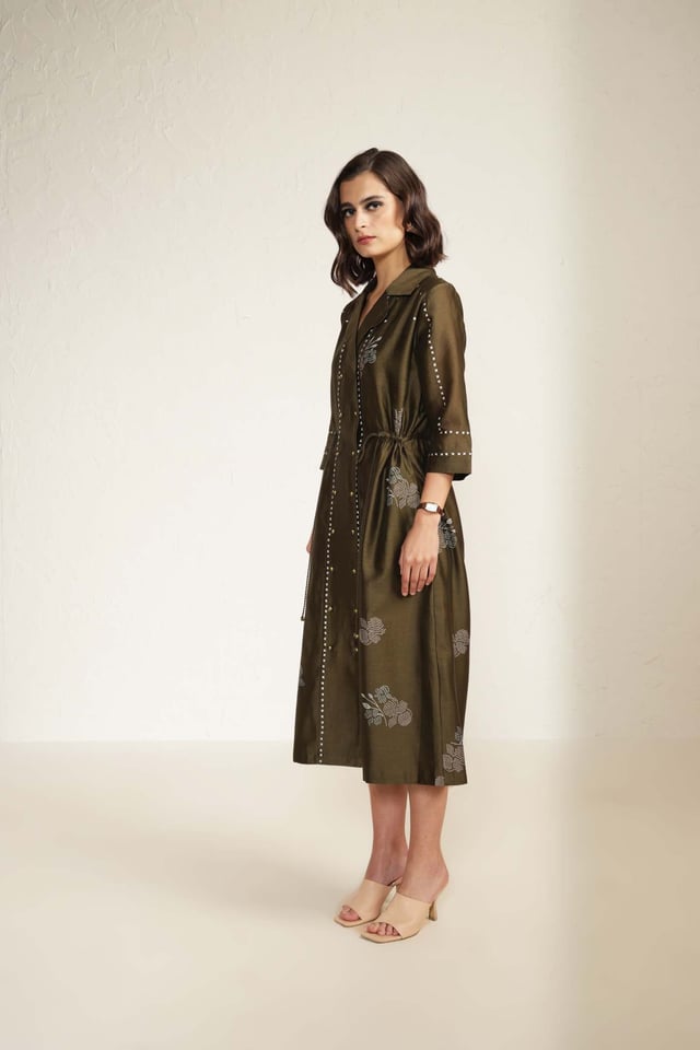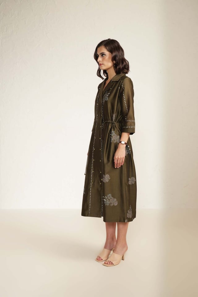 Olive Printed Side Gathered Shirt Dress in Silk Chanderi