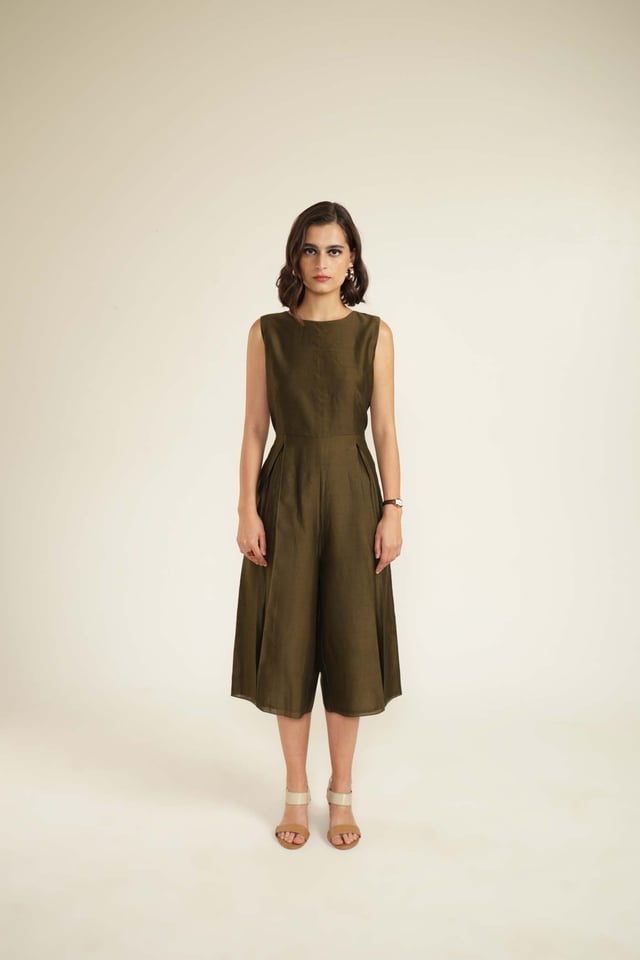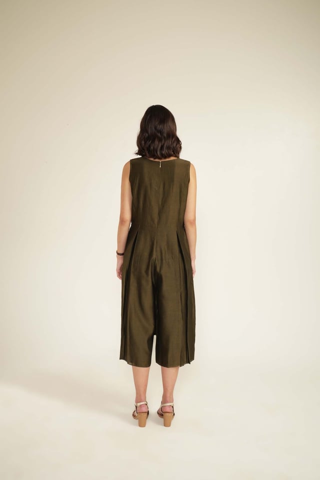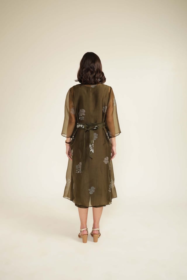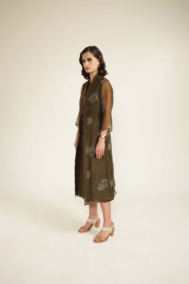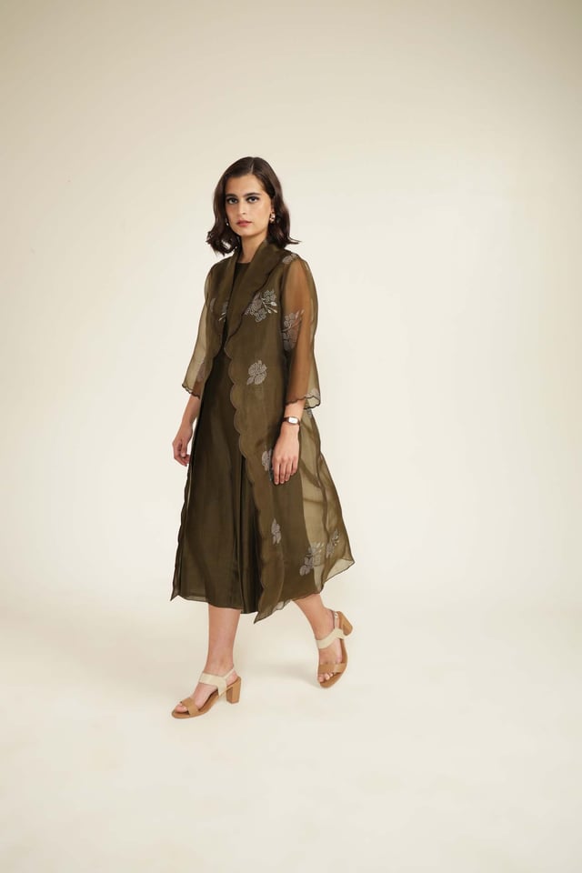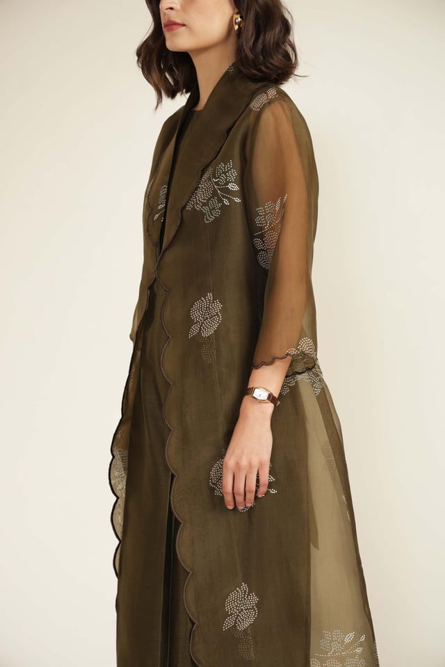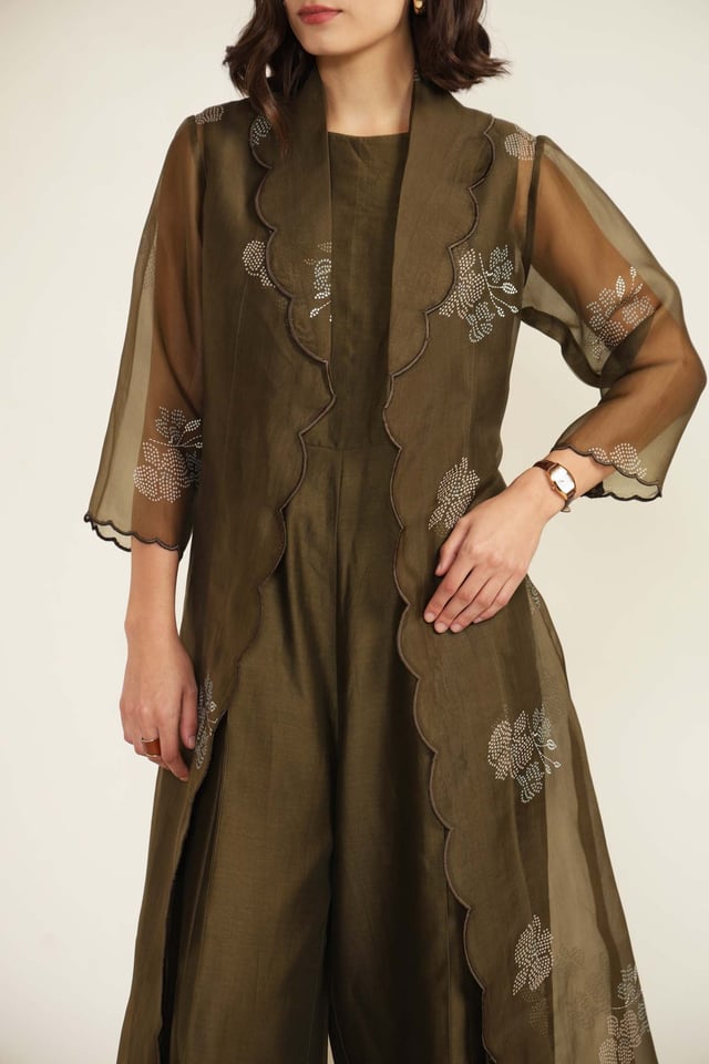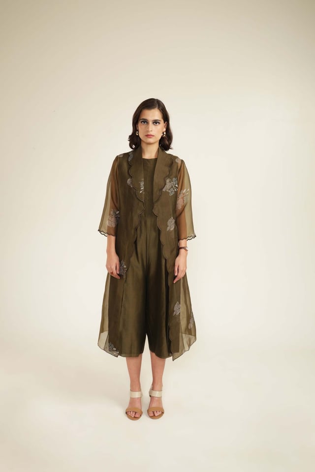 Solid Jumpsuit in Silk Chanderi with Scalloped Collar Printed Organza Jacket
