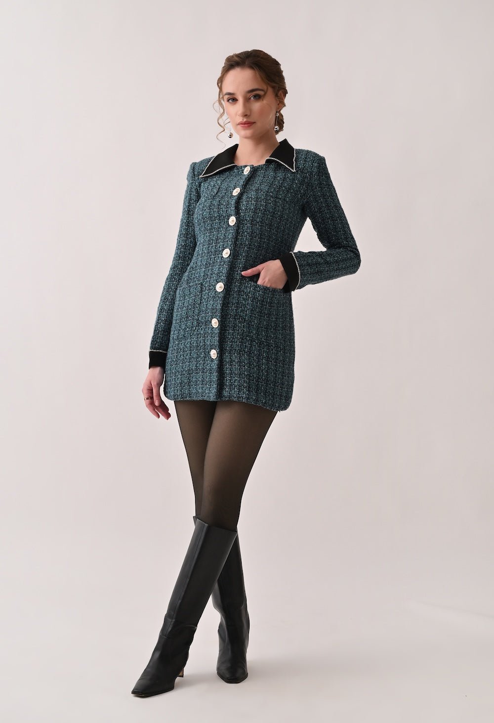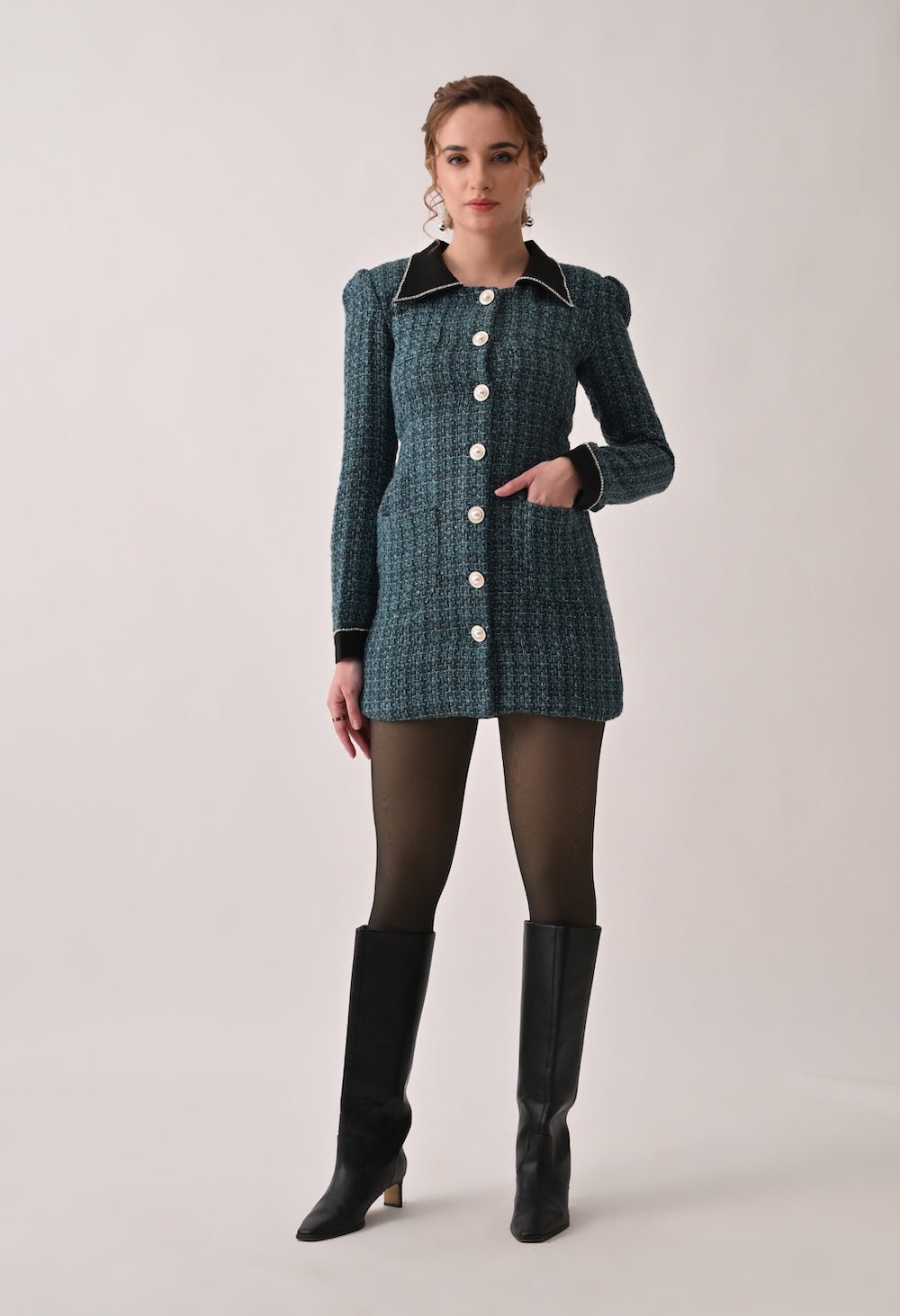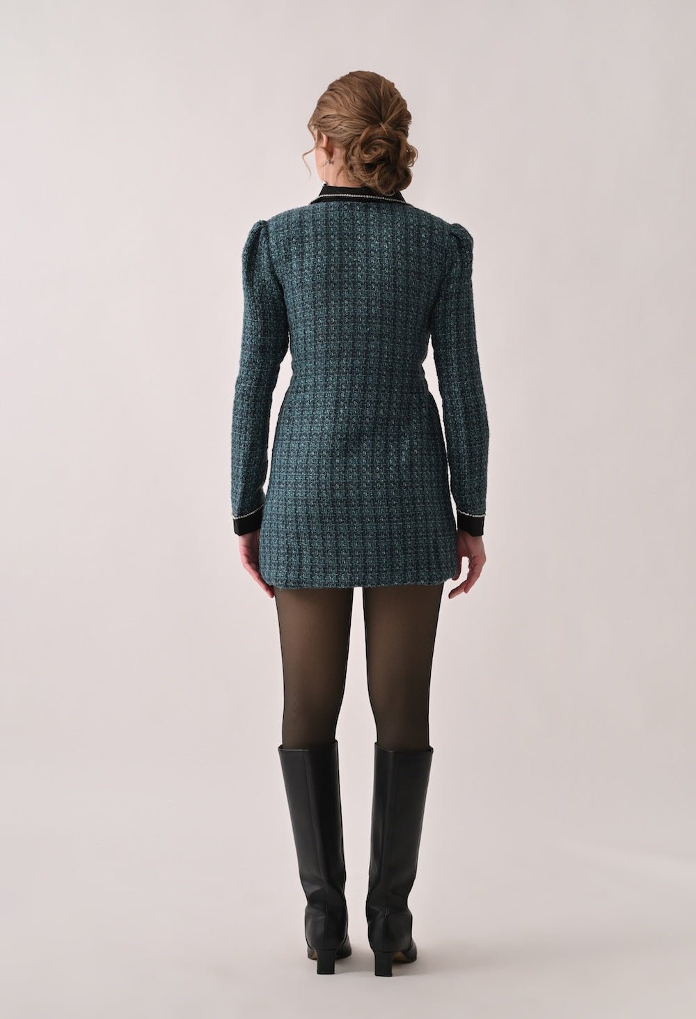 Tweed Blazer Dress with Contrasting Black Collar and Cuffs