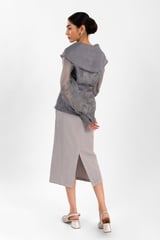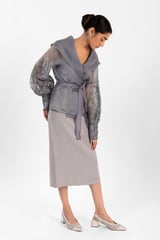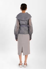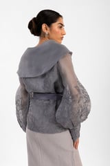 Grey Sheer Silk Organza Wrap Top with Shawl Collar