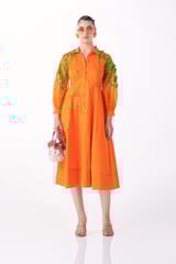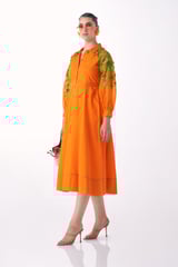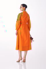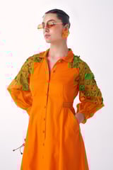 Orange Fit and Flare Midi Shirt Dress with Organza Sleeves