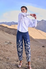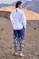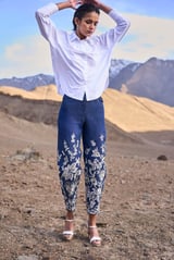 Indigo Barrel-Leg Denim Trousers with Floral Embroidery